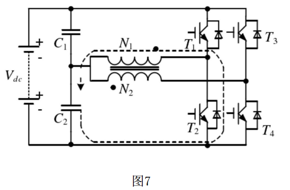 (3)⑦ 狀態(tài)在⑥ 狀態(tài)的續(xù)流完成后開始,該狀態(tài)下開關(guān)管T3導(dǎo)通,T1,T2,T4關(guān)斷;電流從上電容C1正端流出,經(jīng)過開關(guān)管T3、N2線圈后流回上電容C1的負(fù)端,此時: