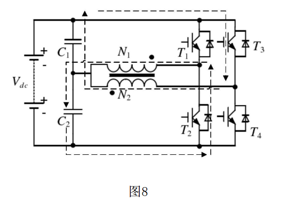 (4)⑦ 狀態(tài)后緊接著是⑧ 狀態(tài),該狀態(tài)下T1、T2、T3、T4關(guān)斷;該狀態(tài)為⑦ 狀態(tài)的續(xù)流階段,電流從N2圈的同名端流出,經(jīng)過下電容C2、二極管D4后流回到N2線圈的非同名端,該回路的電流不斷減小,直到為0。