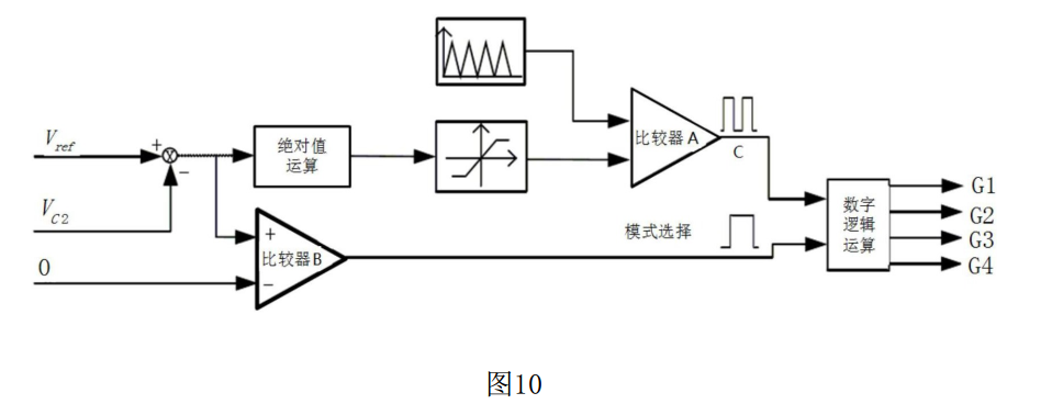 本發(fā)明的網(wǎng)絡(luò)拓?fù)浣Y(jié)構(gòu)增加了四個開關(guān)管,由電路的模態(tài)分析,通過變壓器的繞組交替作為原邊繞組,最終設(shè)計的控制電路如圖10所示。所述驅(qū)動信號生成模塊包括減法運算單元,絕對值運算單元、限幅單元、三角波載波信號發(fā)生單元、多個比較器、數(shù)字邏輯運算單元、0V電壓給定單元;