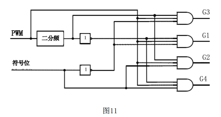 原始PWM信號先通過二分頻,二分頻的輸出及其取反信號用于控制兩個上開關(guān)管還是兩個下開關(guān)管交替導(dǎo)通,符號位及其取反信號用于控制兩個上開關(guān)管的使能還是下開關(guān)管的使能。最終通過四個三輸入與門進(jìn)行信號的耦合,來分別控制四個開關(guān)管的開通關(guān)斷。