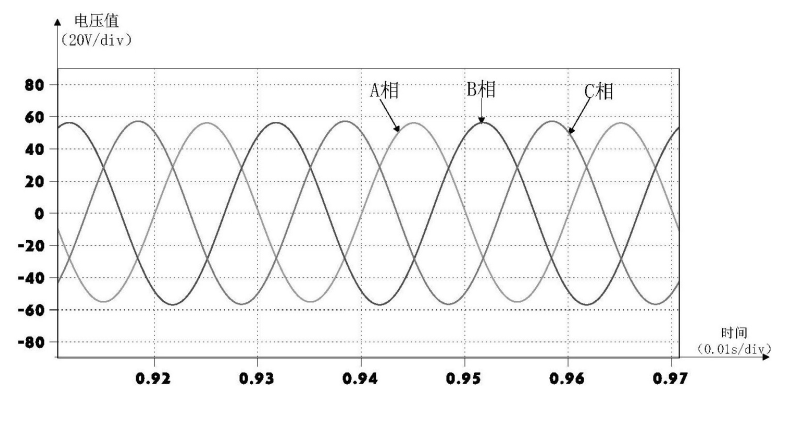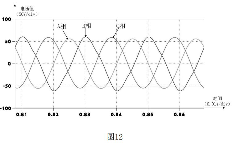 圖12為傳統(tǒng)逆變器輸出電壓波形,圖12表明,0.81s到0.87s時可以發(fā)現(xiàn)B相電壓波形發(fā)生了比較明顯的畸變和不對稱。