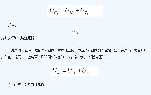 (2)所述② 狀態(tài)為① 狀態(tài)的續(xù)流階段,電流從N1線圈的同名端流出,依次經(jīng)過與開關(guān)管T1反并聯(lián)的二極管D1、上電容C1后流回N1線圈的非同名端,該電流不斷減小,最終為0;