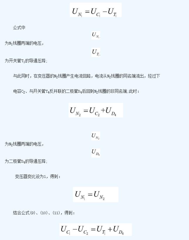 上電容C1的電壓值與下電容C2的電壓值之差為開關(guān)管T1的導(dǎo)通壓降與二極管D4的導(dǎo)通壓降之和;上電容C1在該工作狀態(tài)中不斷放出能量,能量被N1線圈吸收后傳遞給N2線圈,然后由N2線圈通過二極管D4不斷向下電容C2充電;在這個過程中,上電容C1放電,下電容C2充電, 不斷減小, 不斷增加,二者電壓差減少;