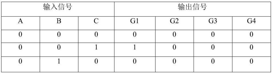 為了防止同一個橋臂上兩個開關(guān)管在切換導(dǎo)通時刻橋臂的直通,一般需要加入一段上下開關(guān)管都不導(dǎo)通的死區(qū)時間,因此在設(shè)計中用不同的二分頻控制信號來分別決定同一橋臂上兩個開關(guān)管的開通和關(guān)斷。以符號位A,二分頻信號B和PWM信號C作為輸入量,以四個開關(guān)管控制信號G1、G2、G3和G4為輸出信號的真值表,如表1所示。