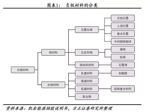 負(fù)極可分為碳材料和非碳材料兩大類(lèi),碳材料包括人造石墨、天 然石墨、中間相碳微球和硬碳軟碳等,非碳材料包括硅基材料、錫基 材料和鈦酸鋰等。硬碳軟碳在技術(shù)上還不夠成熟,硅基等合金類(lèi)負(fù)極 材料雖然已開(kāi)始在特斯拉/松下動(dòng)力電池上應(yīng)用,但仍處于推廣的初期,需求還比較有限。中間相碳微球具備倍率性能優(yōu)異的特點(diǎn),但是制備工藝復(fù)雜、產(chǎn)率低、成本難以下降,發(fā)展也比較受限。目前應(yīng)用最廣的負(fù)極材料仍然是天然石墨和人造石墨兩大類(lèi)(以及性能介于天然石墨和人造石墨之間,以天然石墨為基礎(chǔ)和其他負(fù)極材料摻雜形成的復(fù)合石墨)。