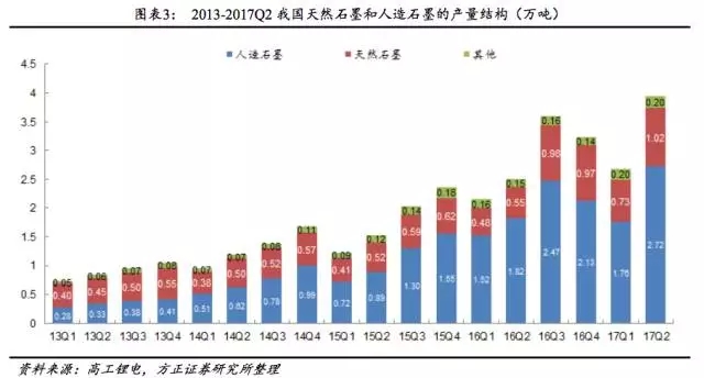 從我國(guó)負(fù)極材料的產(chǎn)量結(jié)構(gòu)看,13 年時(shí)天然石墨占比仍在 50%以上;但人造石墨的滲透率不斷的提升,到 16-17 年,人造石墨的產(chǎn)量已經(jīng)超過(guò)了天然石墨的 2 倍,成為最主要的負(fù)極材料品種。