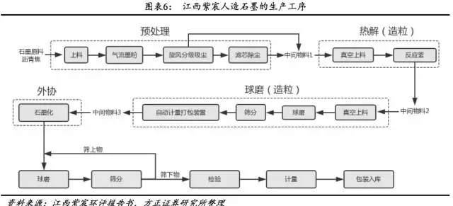 以人造石墨出貨量排名國(guó)內(nèi)第一的江西紫宸為例,其人造石墨的制備工藝流程圖如下: