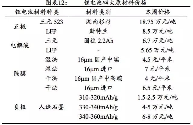正極和隔膜都是相對(duì)標(biāo)準(zhǔn)化的產(chǎn)品:動(dòng)力電池使用的正極材料只有三元和磷酸鐵鋰 2 種,三元 523 的價(jià)格大概是18 萬(wàn)元每噸、三元622的價(jià)格是 21 萬(wàn)元每噸、磷酸鐵鋰的價(jià)格是 8.5 萬(wàn)元每噸;隔膜也 只有干法隔膜和濕法隔膜 2 種,目前的不含稅基膜價(jià)格分別是 3 元每平方米和 4 元每平方米左右。電解液在配方和添加劑上可以體現(xiàn)一定的差異性,這一點(diǎn)與負(fù)極有些類(lèi)似,但其價(jià)格范圍也比較窄,如 2015年各家電解液企業(yè)的銷(xiāo)售單價(jià)基本都在 3 到 4 萬(wàn)元每噸,電解液售價(jià)的核心影響因素仍然是碳酸鋰和六氟磷酸鋰的價(jià)格。