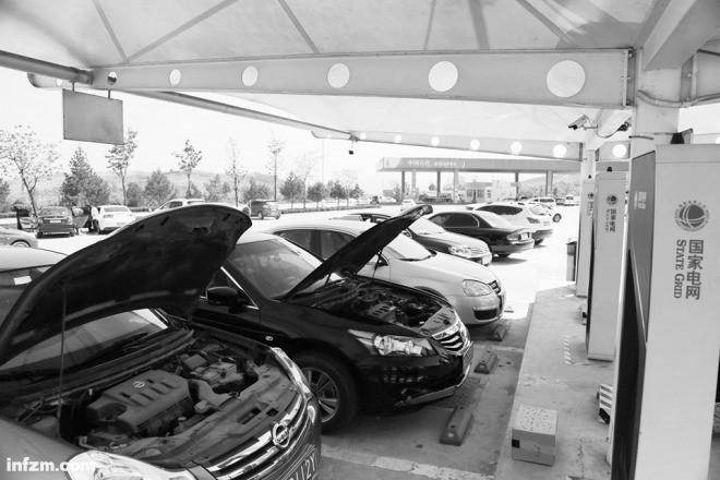 2017年5月1日,山東濟(jì)南高速公路章丘服務(wù)站已引入新能源充電樁與專用充電車位,方便新能源車輛充電。(視覺中國/圖)