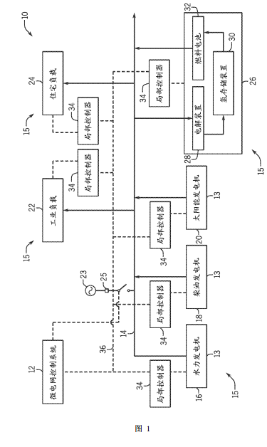 在圖示的實施例中,微電網(wǎng)10可包含各種功率發(fā)電機源13,比如例如水力發(fā)電機16、柴油發(fā)電機18和太陽能發(fā)電機20。在其他實施例中,微電網(wǎng)10可包含其他形式的可分派、不可分派或可再生發(fā)電源,比如例如組合熱和功率發(fā)電機或風力渦輪機。由這些發(fā)電源產(chǎn)生的功率可經(jīng)由傳輸線14輸送給微電網(wǎng)10內(nèi)的負載。例如,在圖示的實施例中,由水力發(fā)電機16、柴油發(fā)電機18和/或太陽能發(fā)電機20產(chǎn)生的功率可經(jīng)由傳輸線14輸送給工業(yè)負載22或住宅負載24。在其他實施例中,產(chǎn)生的功率可經(jīng)由傳輸線14輸送給其他負載,例如市政當局(例如,一個或多個房子、住宅區(qū)域、建筑、城市等)、車輛充電系統(tǒng)和/或商業(yè)設(shè)施(例如,一個或多個商店、制造廠、商業(yè)區(qū)等)。在某些實施例中,微電網(wǎng)10可在共同耦合25(例如,PCC 25)的點處通過斷路器耦合于主電網(wǎng)23(例如,公用事業(yè))。