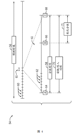 在整個時間步61(例如,在AB時間窗口和BC時間窗口兩者中連續(xù)地)中,微電網(wǎng)控制系統(tǒng)12從微電網(wǎng)資產(chǎn)15讀取信息并且在讀取/寫入過程70中將命令/指令寫入微電網(wǎng)資產(chǎn)15。讀取/寫入過程70可在時間間隔62內(nèi)發(fā)生,例如以每10秒、20秒、30秒等等。特別地,在時間點B 66處,在AB時間窗口期間收集的信息或數(shù)據(jù)(例如,從微電網(wǎng)資產(chǎn)15讀取的信息)被鎖存并且可形成數(shù)據(jù)文件并將其存儲在存儲器組件50內(nèi)。該數(shù)據(jù)文件可被微電網(wǎng)控制系統(tǒng)12使用,并且更具體地,通過運行微電網(wǎng)優(yōu)化程序代碼的處理器46訪問,以在優(yōu)化分派過程71期間在BC時間窗口中計算微電網(wǎng)優(yōu)化調(diào)度。對優(yōu)化問題的最優(yōu)解決方案可在時間點C68處結(jié)束,并且優(yōu)化分派調(diào)度(例如,指令、命令或決策)經(jīng)由通信路徑36而與微電網(wǎng)資產(chǎn)15通信。采用該方式,新的命令將每幾秒(例如,10秒)與微電網(wǎng)資產(chǎn)15通信直到通過處理器46生成新的優(yōu)化問題并且在下一個時間步61內(nèi)對其求解。簡而言之,在某些實施例中,微電網(wǎng)控制系統(tǒng)12包含兩個相對快和慢的過程:每幾秒(例如,10秒)出現(xiàn)的快速讀取/寫入過程70,和在時間步61內(nèi)每幾分鐘/小時(例如,12分鐘)出現(xiàn)的慢優(yōu)化問題。如在圖4中圖示的,讀取/寫入過程70和優(yōu)化分派過程71兩者都在當前時間步61內(nèi)的相同時間窗口(例如,時間窗口BC)內(nèi)出現(xiàn)。然而,在某些實施例中,在時間點C 68處傳送的優(yōu)化分派調(diào)度僅基于在時間點B 66處被收集并且存儲到數(shù)據(jù)文件中的鎖存數(shù)據(jù)。
