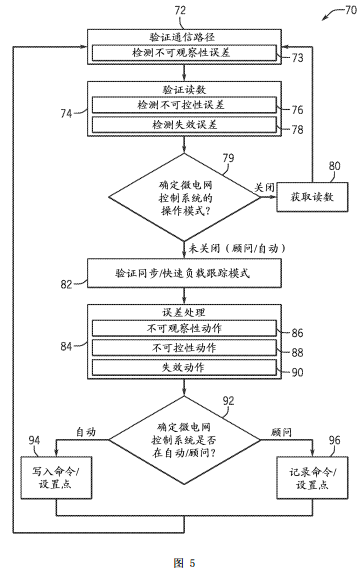 在驗證通信路徑36時,控制系統(tǒng)12可與微電網(wǎng)資產(chǎn)15通信,并且具體地,可從微電網(wǎng)資產(chǎn)15讀取信息。從微電網(wǎng)資產(chǎn)15讀取的信息可包含資產(chǎn)15的性能歷史或歷史統(tǒng)計、由資產(chǎn)15生成的功率量、由資產(chǎn)15傳送、存儲或接收的能量的量、資產(chǎn)15的操作模式或狀態(tài)等等。因此,方法70則包含驗證從微電網(wǎng)資產(chǎn)15收集的讀數(shù)(框74)。在該驗證過程期間,控制系統(tǒng)12可配置成監(jiān)測和檢測各種類型的不可控性和失效誤差。在一些實施例中,存在可被控制系統(tǒng)12檢測的五個類型的不可控性誤差(框76)。不可控性類型I指在線設(shè)備從控制系統(tǒng)12接收關(guān)閉命令但它未關(guān)閉時的情況。不可控性類型II指離線設(shè)備從控制系統(tǒng)12接收打開命令但它未接通時的情況。不可控性類型III指在改變設(shè)備或資產(chǎn)的操作模式方面的不成功嘗試。例如,柴油發(fā)電機18使每10秒從控制系統(tǒng)12接收命令保持在同步操作模式,但這并未發(fā)生。不可控性類型IV對應(yīng)于參考功率命令和來自微電網(wǎng)10的對應(yīng)實際讀數(shù)之間的差異超過某一水平時的情況。不可控性類型V指在控制系統(tǒng)12未處于自動操作模式時局部控制器34的非期望激活。在這類情形中,采用局部控制器34的優(yōu)化命令的傳達或?qū)懭脒^程(例如,優(yōu)化分派過程71)僅在控制系統(tǒng)12處于自動模式時發(fā)生。同樣,在控制系統(tǒng)12處于關(guān)閉或顧問模式時局部控制器34的操作未被預期。盡管描述五個類型的不可控性誤差,應(yīng)注意根據(jù)在微電網(wǎng)10內(nèi)操作的不同類型的微電網(wǎng)資產(chǎn)15可檢測或監(jiān)測任何數(shù)量的不可控性誤差。