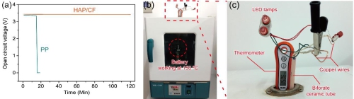 采用新型羥基磷灰石超長納米線基耐高溫電池隔膜組裝的電池在150℃高溫環(huán)境中能夠保持正常工作狀態(tài)并點(diǎn)亮小燈泡
