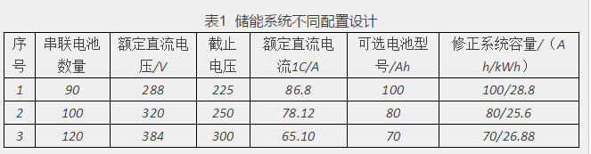 考慮到是光儲一體化的應(yīng)用場景,充放電頻率按照平均一天一次;充放電電流最大1C。鋰離子電池儲能系統(tǒng),單體電池電壓為3.2V(標(biāo)準(zhǔn)),2.5V電壓截止。表1列出了滿足本系統(tǒng)要求的3種儲能系統(tǒng)的配置。