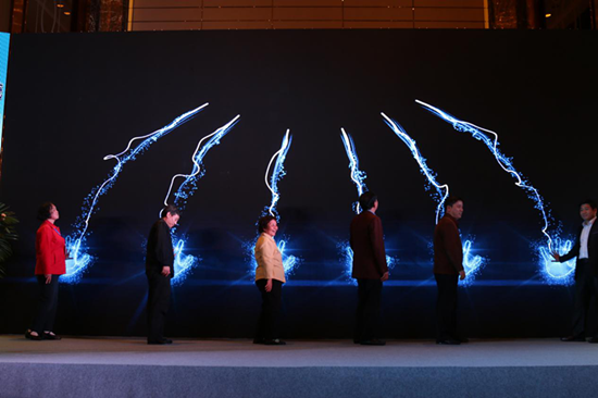 致辭結束后,原安徽省副省長宋明、中科院物質研究院專家馮士芬、原安徽省能源局總工錢立家、安徽省電力設計院新能源公司總經(jīng)理蔣克勇、合肥聚能新能源科技有限公司副總裁周昌進、合肥聚能新能源科技有限公司副總裁盧琳上臺,共同啟動聚能·百姓+家用儲能光伏系統(tǒng)