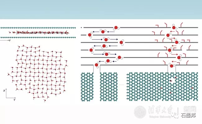 圖1 左:石墨烯層間水團(tuán)簇的有序結(jié)構(gòu);右:氧化石墨烯跨膜水?dāng)U散行為示意。