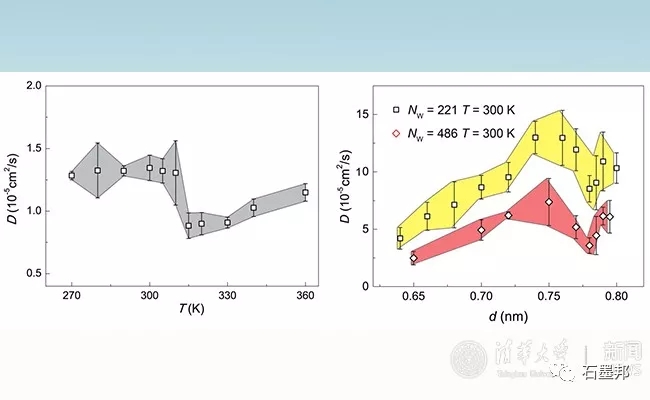 圖2 石墨烯層間納米受限水團(tuán)簇的集體擴(kuò)散系數(shù)D與溫度T(左)、層間距d(右)的關(guān)系(Nw是水團(tuán)簇中水分子的個(gè)數(shù))。