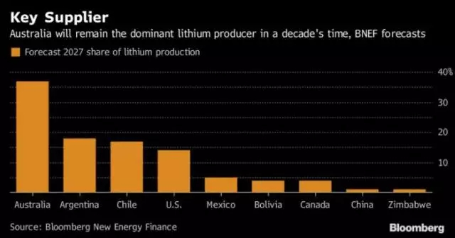 下圖是彭博社新能源金融對(duì)全球主要鋰礦國(guó)家到2027年產(chǎn)量占比柱狀示意圖。