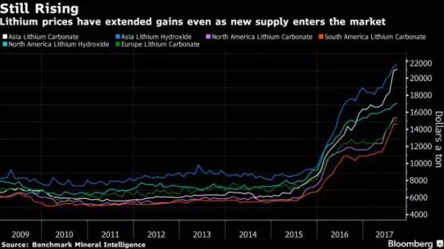 下圖是彭博社提供的鋰礦價(jià)格自2009年至今的走勢(shì)圖,顯示雖然有很多的鋰礦產(chǎn)能加入,但是全球鋰的價(jià)格自2015年開(kāi)始就進(jìn)入上升通道。