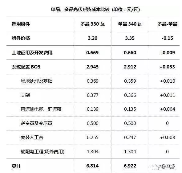 上表我們假設(shè)電站系統(tǒng)選用多晶330瓦或單晶340瓦組件所對應的系統(tǒng)成本對比,包含組件、逆變器、匯流箱、支架、線纜、土地、人工等成本。