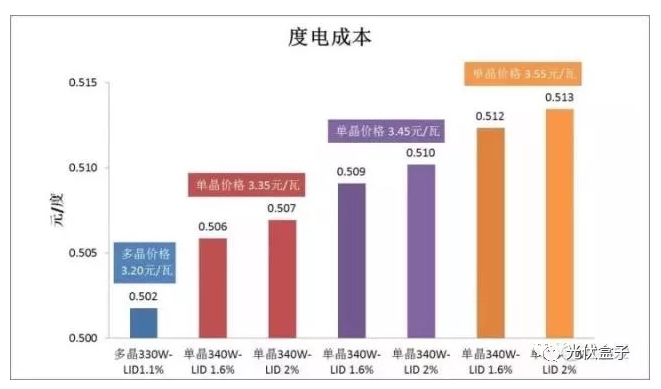 當單晶的初始光衰為2%,單晶組件價格必須低于多晶0.01元/瓦,任何超出以上價差范圍(-0.01元~+0.02元/瓦)的單晶組件,將導致單晶光伏電站系統(tǒng)的度電成本高出多晶光伏電站系統(tǒng),降低了太陽能電站的投資回報率。