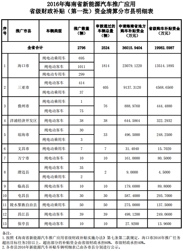 根據(jù)省財(cái)政廳、省工業(yè)和信息化廳、省公安廳《關(guān)于印發(fā)海南省新能源汽車推廣應(yīng)用省級(jí)財(cái)政補(bǔ)貼實(shí)施辦法的通知》(瓊財(cái)建〔2016〕2105號(hào))的有關(guān)規(guī)定,省工業(yè)和信息化廳聯(lián)合省財(cái)政廳分別于2016年12月、2017年8月印發(fā)了《關(guān)于做好2016年全省新能源汽車推廣應(yīng)用財(cái)政補(bǔ)貼申報(bào)工作的通知》(瓊工信高〔2016〕410號(hào))、《關(guān)于做好2016年全省新能源汽車推廣應(yīng)用財(cái)政補(bǔ)貼核算工作的通知》(瓊工信高〔2017〕251號(hào))。經(jīng)過購(gòu)車消費(fèi)者申報(bào)補(bǔ)貼、各市縣審核、會(huì)計(jì)師事務(wù)所財(cái)務(wù)審核、各市縣補(bǔ)貼資金再次審核并公示、省級(jí)財(cái)政補(bǔ)貼集中清算等流程,擬下達(dá)2016年海南省新能源汽車推廣應(yīng)用省級(jí)財(cái)政補(bǔ)貼資金(第一批)19982.5987萬元,現(xiàn)予以公示,公示時(shí)間為2017年10月23日至10月27日。任何單位和個(gè)人如有異議,請(qǐng)?jiān)诠酒趦?nèi)以書面形式向受理單位提出。提出異議的,應(yīng)當(dāng)在異議材料上簽署真實(shí)姓名或加蓋單位公章,并注明聯(lián)系方式。