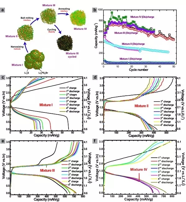 a. 通過簡單混合、球磨、熱處理方式來處理電池正極-電解質(zhì)混合物(Ⅰ簡單混合的micro-Li2S, Ⅱ簡單混合的nano-Li2S, Ⅲ球磨共混的nano-Li2S, Ⅳ熱處理共混的nano-Li2S)。