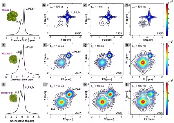 (其中Ⅰ-Ⅱ簡單混合的樣品沒有明顯的“對角線外反十字峰”表明該過程鋰離子交換作用弱,而Ⅲ經(jīng)球磨法混合的樣品的“對角線外反十字峰”出現(xiàn)在10ms處,表明正極-固態(tài)電解質(zhì)界面明顯的鋰離子交換。)