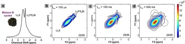 b-d. 樣品處理階段Ⅲ的電極-電解質(zhì)混合物經(jīng)循環(huán)充放電后對應(yīng)的二維7Li - 7Li固態(tài)核磁交換譜。(500ms后才出現(xiàn)明顯的鋰離子交換“對角線外反十字峰”,表明循環(huán)充放電過程破壞了界面接觸,影響了鋰離子傳輸)
