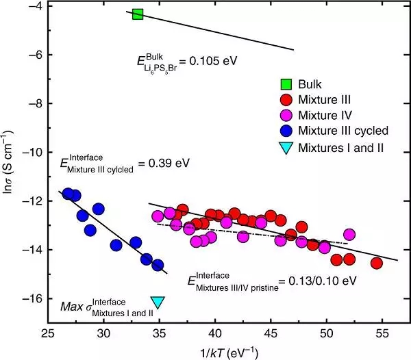 由圖中可知,簡單混合的微米和納米尺寸Li2S-Li6PS5Br混合物界面導(dǎo)電性差,因此鋰離子的傳輸效果差。而球磨法混合的Li2S-Li6PS5Br混合物表現(xiàn)處很好的鋰離子界面電導(dǎo)率。