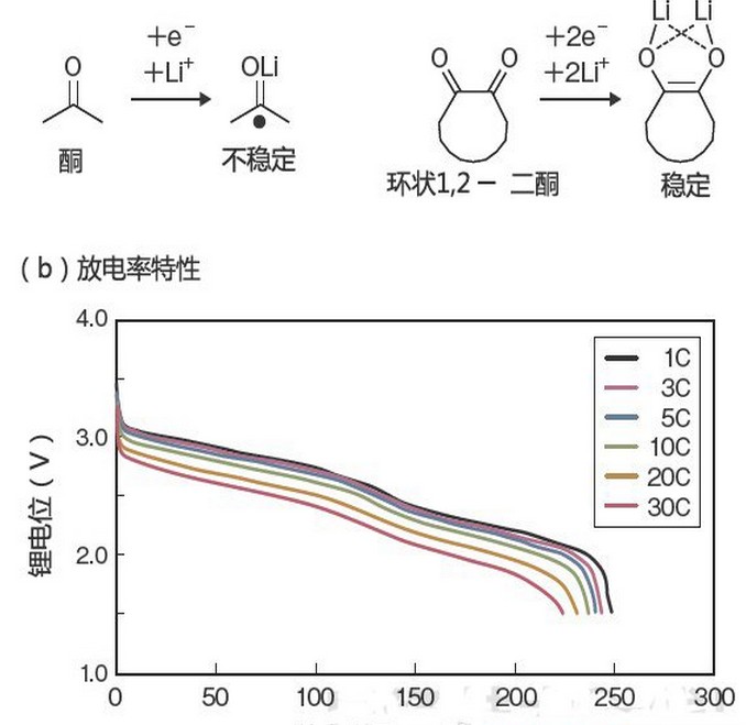 京都大學(xué)和松下開發(fā)出了正極材料采用將兩個酮連接形成環(huán)狀構(gòu)造的環(huán)狀1,2-二酮的有機充電電池(a)。支持30C的高速充放電(b)。