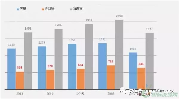 圖2. 2013年至今我國(guó)天然氣產(chǎn)量、進(jìn)口量及消費(fèi)量情況(單位:億立方米)