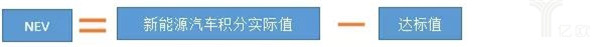NEV積分為該企業(yè)新能源汽車積分實際值與達標值之間的差額。同樣的,實際值高于達標值產(chǎn)生正積分,低于達標值產(chǎn)生負積分。