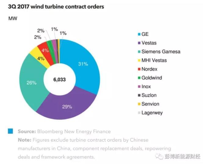 2017年第三季度,美國風機制造商GE的風機合同訂單規(guī)模為1887MW,超過競爭對手維斯塔斯(Vestas)成為世界訂單規(guī)模最大的廠商。