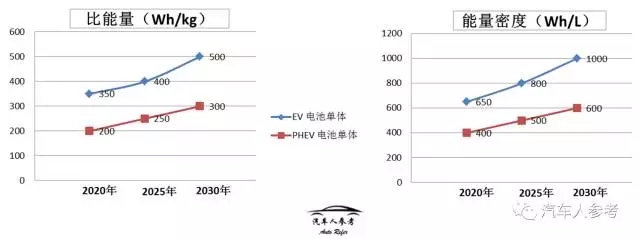 根據(jù)16年發(fā)布的“節(jié)能與新能源汽車技術(shù)路線圖”,我們可以大概對(duì)動(dòng)力電池發(fā)展趨勢(shì)有一個(gè)概念,下圖所示,到2020年,純電動(dòng)汽車電池單體比能量要達(dá)到350Wh/kg