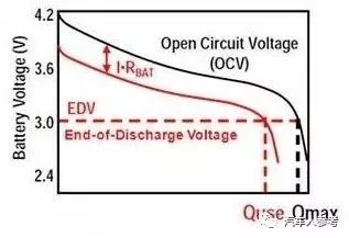 用數(shù)據(jù)說(shuō)話,下圖表示一電池放電曲線,X軸表示放電量,Y軸表示電池開路電壓,電池理想放電狀態(tài)為黑色曲線,紅色曲線是考慮到電池內(nèi)阻時(shí)的真實(shí)狀態(tài)。