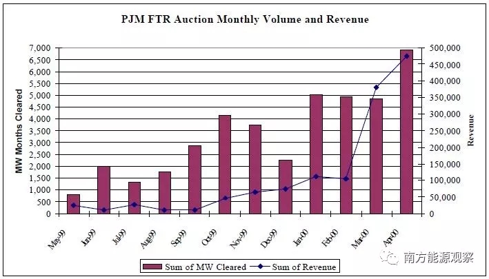 PJM Interconnection, L.L.C.市場(chǎng)監(jiān)管部門發(fā)布的1999年市場(chǎng)報(bào)告中記載,PJM在1999年4月1日引入了完全基于市場(chǎng)化的能量?jī)r(jià)格方法,即節(jié)點(diǎn)電價(jià)模型(LMP,Locational Marginal Price),一個(gè)月后即開啟金融輸電權(quán)市場(chǎng)(FTR, Financial Transmission Rights),市場(chǎng)主體可使用這種機(jī)制來對(duì)沖付出高額阻塞費(fèi)用的風(fēng)險(xiǎn)。