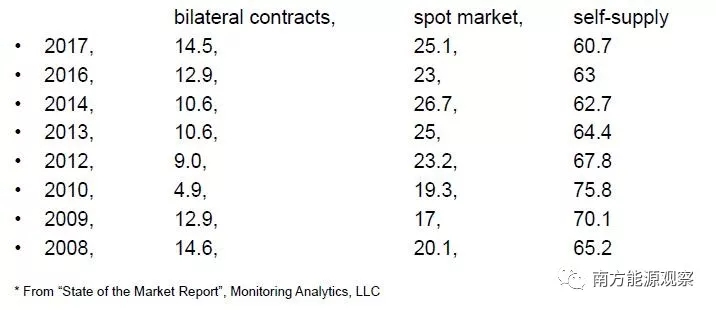 從2008年到2017年,PJM市場(chǎng)中三者比例變化并不明顯,如圖二所示,現(xiàn)貨市場(chǎng)電量基本保持在25%左右,而雙邊協(xié)議和自調(diào)度電量占比達(dá)到75%。