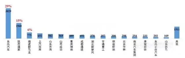 (3)分企業(yè)產(chǎn)量:2017年1-6月,新能源專用車生產(chǎn)企業(yè)達(dá)73家,其中近40%企業(yè)產(chǎn)量不足10輛。前10家企業(yè)新能源專用車產(chǎn)量占比為88%。其中,東風(fēng)汽車公司產(chǎn)量占比29%,領(lǐng)先優(yōu)勢明顯。