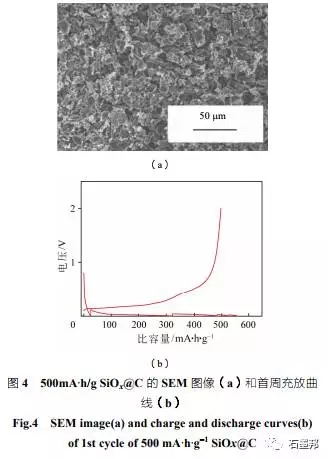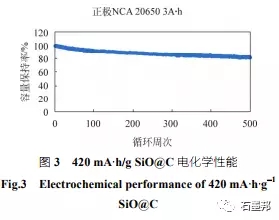 在氧化亞硅碳復合材料方面,已經(jīng)有較為成熟的軟碳包覆工藝,在固相條件下對原材料表面進行高溫熱處理,可以有效提高材料首效、增加導電性、緩解膨脹。目前,項目組已經(jīng)可以制備批次穩(wěn)定性較高的碳包覆氧化亞硅材料,并且在合作單位取得了較好的測試結(jié)果反饋。如420 mA·h/g 的碳包覆氧 化亞硅材料,匹配正極鋰鎳錳酸鋁(NCA),制備成3A·h規(guī)格為20650的鋼殼電池,在1C充電、 10C放電的測試條件下,循環(huán)500 周容量保持80% (圖3)。