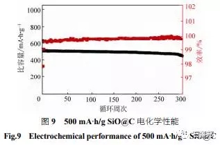 在氧化亞硅碳復合材料方面,項目組主要通過控制氧含量以及與第二相復合對氧化亞硅的電化學性能進行優(yōu)化。其中,對氧化亞硅中硅晶粒的調(diào)控取得了進展并在表面電荷作用下制備出表界面穩(wěn)定的高容量氧化亞硅碳負極材料,有效地提高了氧化亞硅的首次及后續(xù)庫侖效率,改善了其循環(huán)穩(wěn)定性。為進一步改善電極材料的高壓實條件下的性能,項目組采用包覆工藝,并通過對材料復合過程的控制,也取得了較大進展。比容量500 mA·h/g 在1C充放條件下其電化學性能如圖9所示。