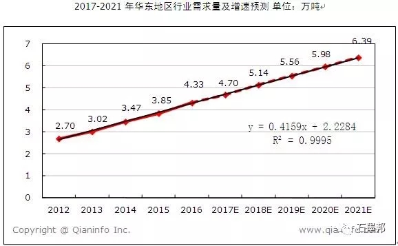 綜上所述,對華東地區(qū)需求量進行線性擬合,得到線性擬合模型y=0.4159x+2.2284,R?=0.9995,判別系數(shù)R2接近1,說明線性模型的擬合度比較好。根據(jù)擬合模型計算出到2021年我國華東地區(qū)行業(yè)需求量將達到6.39萬噸。