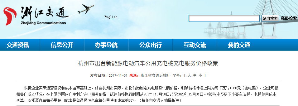 中國儲能網(wǎng)訊:11月1日,浙江省交通運輸廳正式發(fā)布了《杭州市出臺新能源電動汽車公用充電樁充電服務(wù)價格政策》,對杭州市新能源汽車公共充電樁價格進行了規(guī)定。政策表明,根據(jù)企業(yè)實際運營情況和成本監(jiān)審基礎(chǔ)上,結(jié)合杭州市實際,市物價局制定充電服務(wù)試銷價格,明確價格標(biāo)準(zhǔn)上限為每千瓦時1.60元(含電費),企業(yè)可根據(jù)各自成本情況,在上限范圍內(nèi)自主制定充電服務(wù)價格。試銷價格執(zhí)行時間從2017年10月30日起至2020年12月31日。按照7座及以下小客車油耗、電耗使用成本測算,新能源汽車每公里使用成本是普通燃油汽車每公里使用成本的38%。