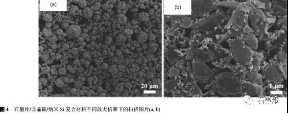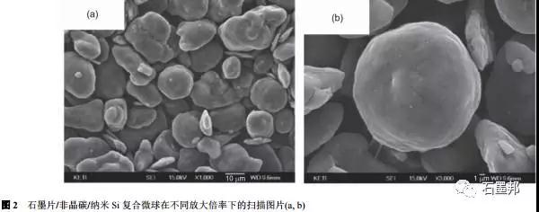 Kim等通過球磨微米Si粉制備納米Si粉,隨后將其與瀝青和石墨片復(fù)合,經(jīng)過機(jī)械造粒、高溫煅燒后獲得納米Si/非晶碳/石墨球狀復(fù)合材料,其中Si含量約為20%,產(chǎn)物的結(jié)構(gòu)如圖2所示.