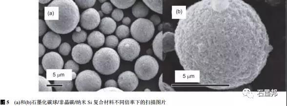 Kim等首先將煤瀝青溶解在四氫呋喃里面, 然后加入納米Si粉和石墨微球;超聲分散均勻后,蒸發(fā)出四氫呋喃獲得前驅(qū)混合物,其中Si和石墨的比例可以通過添加原料來控制.在Ar氣氛中煅燒1000℃后, 瀝青熱解出的非晶碳將納米Si緊密地“粘”在石墨微球的表面, 如圖6所示,所得最終產(chǎn)物為“土豆?fàn)睢鳖w粒, 納米Si均勻地復(fù)合在石墨球外層.