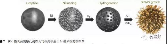 Cho等利用金屬鎳催化作用刻蝕石墨微球獲得多孔的石墨, 隨后利用金屬金催化裂解硅烷在多孔石墨上生長Si納米線, 獲得Si納米線/石墨復(fù)合材料,Si的質(zhì)量分?jǐn)?shù)為20%,圖7展示了制備過程的模擬圖.