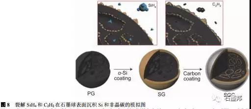 化學(xué)氣相沉積法,主要是以石墨為基底,通過高溫裂解硅烷在石墨表面沉積Si獲得復(fù)合材料.氣相沉積的最大優(yōu)勢(shì)是可以保證納米Si均勻地分布在石墨的表面.