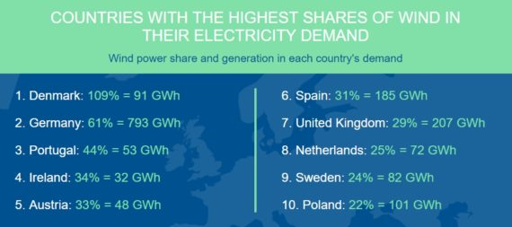 從歐盟成員國來看,丹麥的風(fēng)力發(fā)電量產(chǎn)生剩余,是其國內(nèi)需求的1.09倍,德國風(fēng)力發(fā)電量占其國內(nèi)需求的61%。