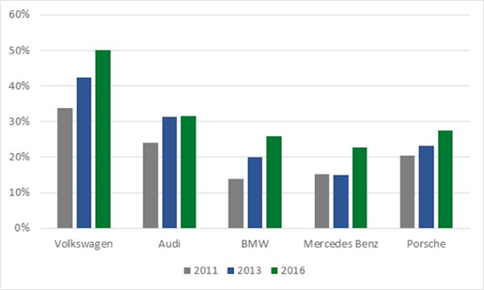 奧迪、寶馬、奔馳和保時(shí)捷在中國(guó)市場(chǎng)的銷量在其全球范圍內(nèi)銷量當(dāng)中的占比均在1/4至1/3內(nèi),與過(guò)去5年相比增長(zhǎng)了10%。此外,大眾在中國(guó)的銷量在全球銷量當(dāng)中的占比近50%。其他境外品牌在中國(guó)市場(chǎng)的表現(xiàn)也表明特斯拉如果能夠減少成本,價(jià)格符合當(dāng)?shù)厥袌?chǎng)水平,那么將也會(huì)有不俗表現(xiàn)。