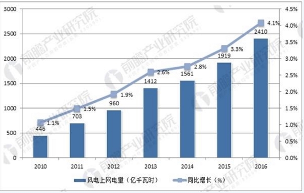 中國風(fēng)電上網(wǎng)電量占總發(fā)電量比例逐年增加,2016年風(fēng)電上網(wǎng)電量為2410億千瓦時,占總發(fā)電量的比重達4.08%, 超越核電(3.56%)和光伏(1.12%)成為我國第一大新能源發(fā)電形式。隨著國家能源局一些列消納措施的落地,風(fēng)電上網(wǎng)電量逐漸攀升,棄風(fēng)限電有望逐步緩解,行業(yè)逐步轉(zhuǎn)向市場化。